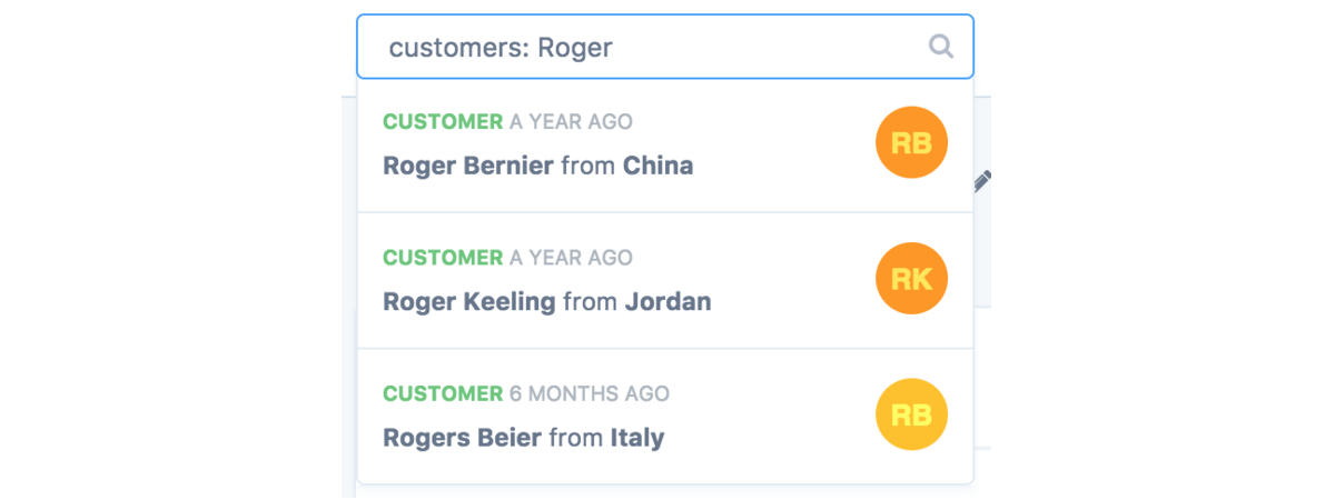 Another great feature it has is the ability to limit your search just to a specific 'resource'. So if I knew I was looking for a specific product or customer, I can limit it by starting the search with the resource. For example, customers: Roger would limit the search to customers that match Roger.